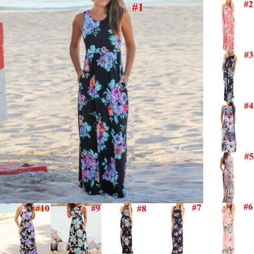 Women Floral Print Sleeveless Long Maxi Evening Gown