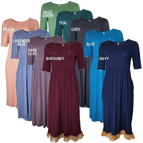 Women's Elastic Waist Midi Dress With Pockets (9 Colours) with Fringes