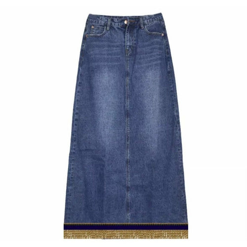 Women's Light Denim Jean Maxi Skirt With Fringes