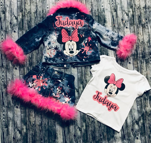Minnie Mouse Inspired fuzzy 3 Piece Denim Set. Please Read Description Below On How To Place Your Order.